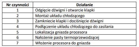 Wskaż poprawną kolejność czynności prowadzących do zamontowania procesora w gnieździe LGA na nowej płycie głównej, odłączonej od źródła zasilania.