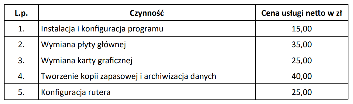 Serwisant dojechał do klienta oddalonego od siedziby firmy o 11 km oraz wykonał u niego czynności naprawcze zawarte w tabeli. Wskaż całkowity koszt brutto jego pracy, jeśli dojazd do klienta kosztuje 1,20 zł/km brutto i jest on liczony w obie strony. Stawka podatku VAT na usługi wynosi 23%.